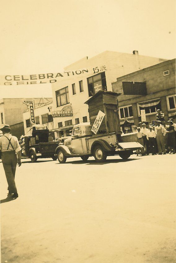 Outhouse on pickup truck. Springfield Industrial Parade, 1941.