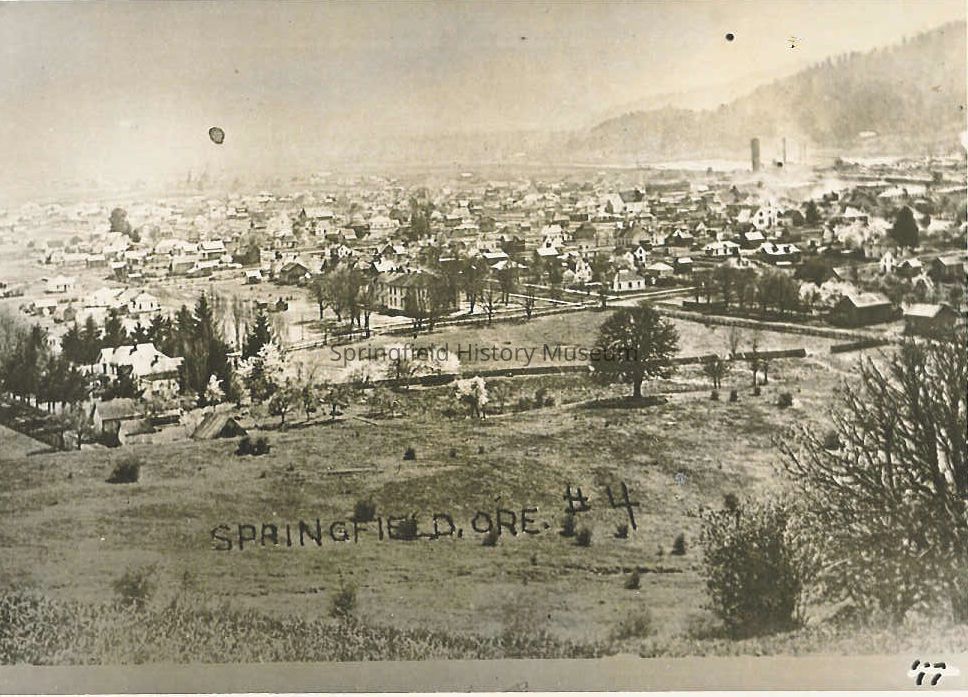 Photograph of an overview of Springfield from Kelly Butte looking east, southeast. Looking down on Mill Street and the school [in the center of photo].