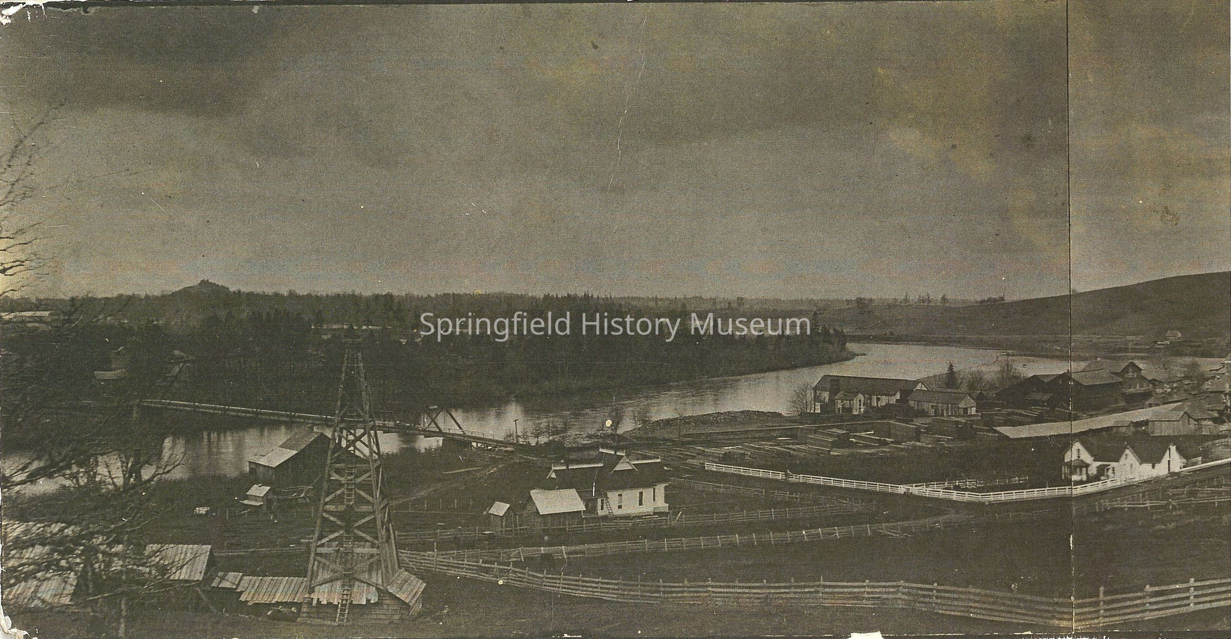 Overview of Springfield facing north. Reverse side of photo descibes various buildings beginning with wagon bridge to Glenwood, two mills, IOOF Hall, two churches, Springfield High School, and Opera House. Distinctive features of photo are: White fence in fore ground, wooden tower of mill on left, church on right edge, and "Nichols Photo" in right bottom corner.