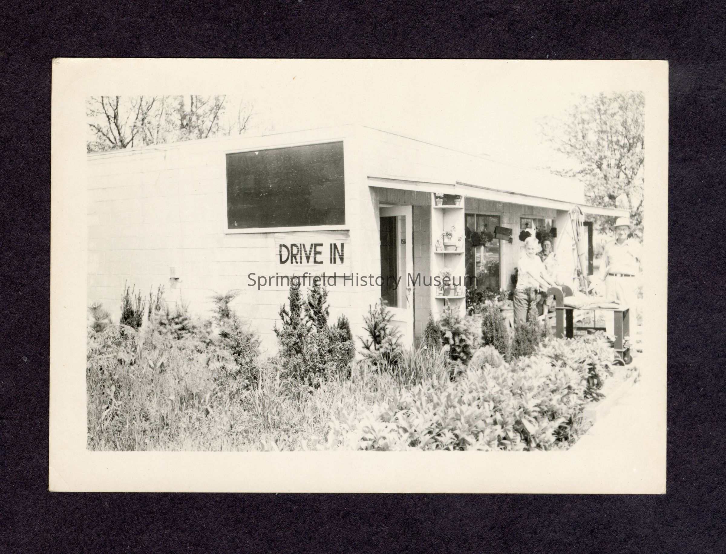 Photo: Two adults and a child stand in front of the building. On the wall is a "Drive In" sign.