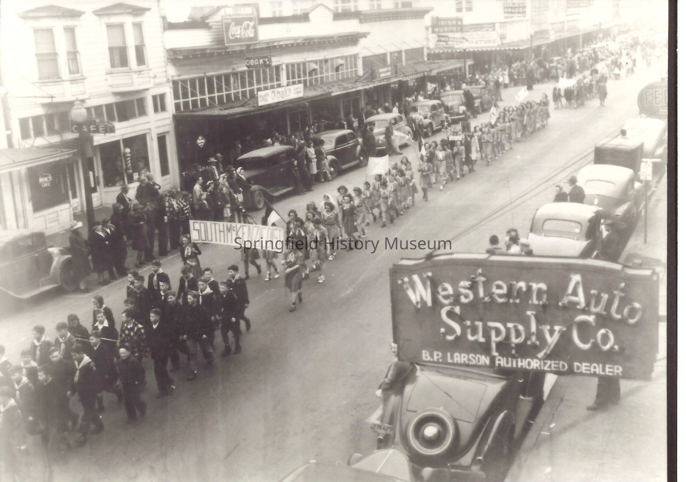 Photograph of parade going through town area with two people holding a sign that says South McKenzie Dist., on right side is a sign Western Auto Supply Co. B. P. Larson Authorized Dealer, undated