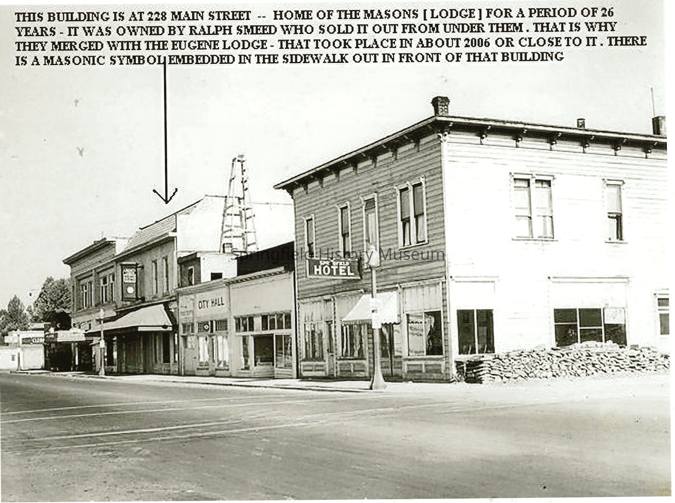 Transcribed inscription on front: "This building is at 228 Main Street -- Home of the Masons (Lodge) for a period of 26 years -- it was owned by Ralph Smeed Who sold it out from under them. That is why they merged with the Eugene Lodge -- the too place in about 2006 or close to it. There is a masonic symbol embedded into the sidewalk out in front of that building"Photograph Details