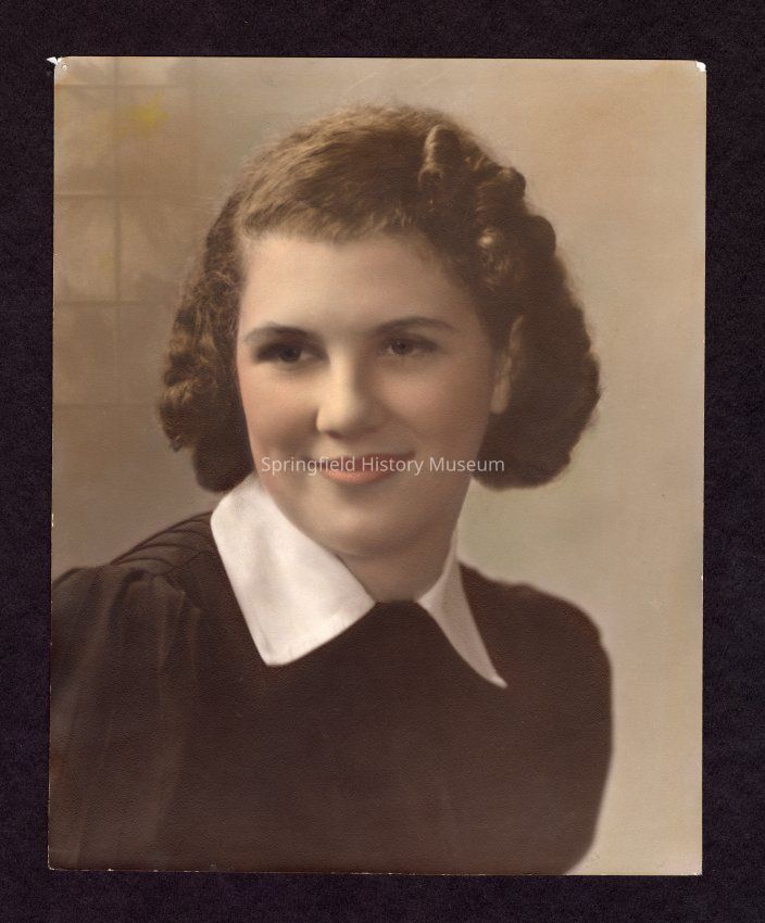 Color photograph of young woman. Photograph is labeled handwritten on back "Patricia Stockwell 1940".