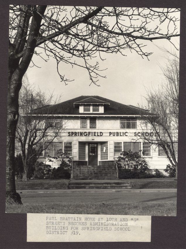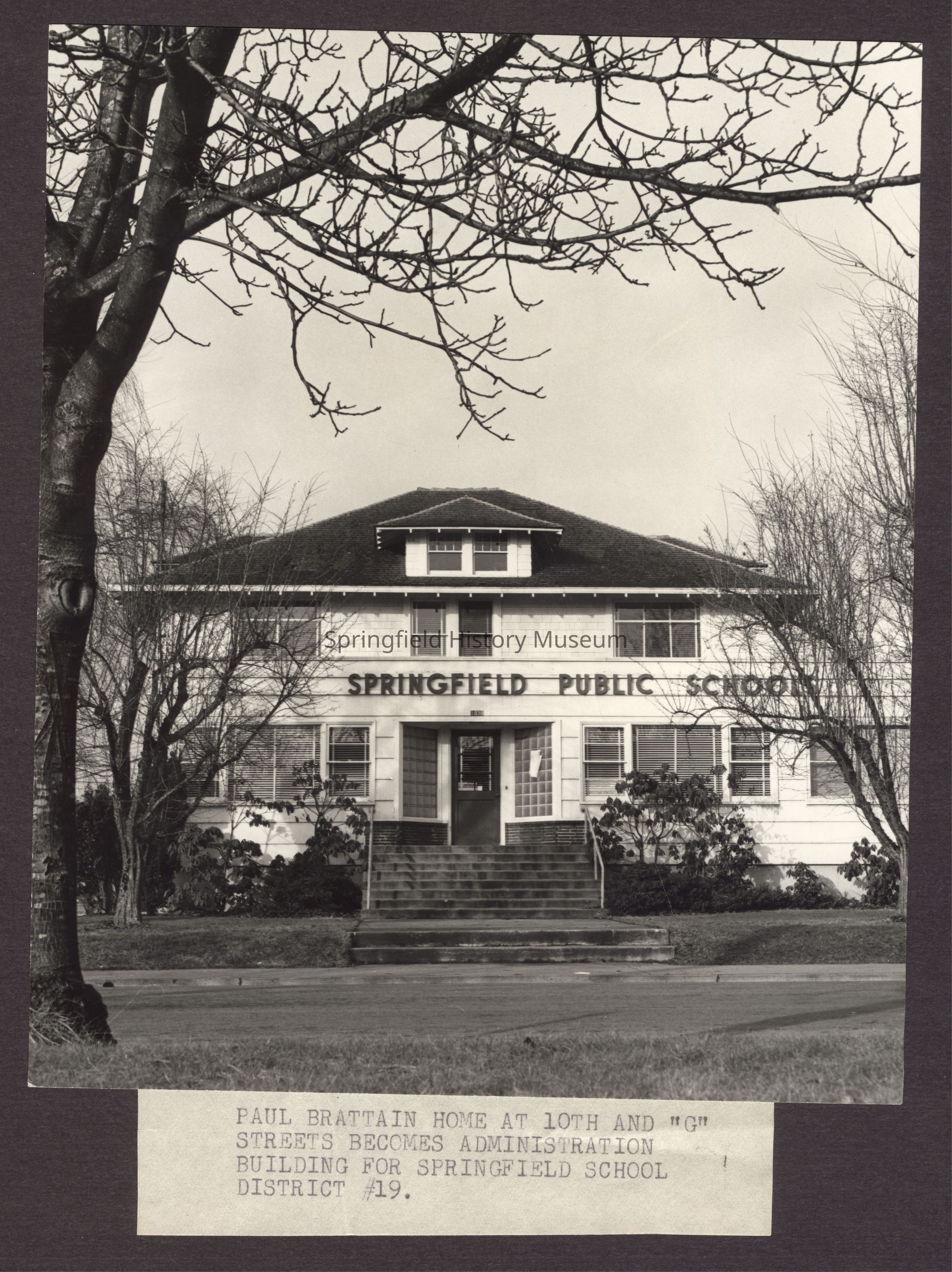 B&W Photo of Paul Brattain home at 10th and "G" St. becomes administration building for Springfield School District #19.