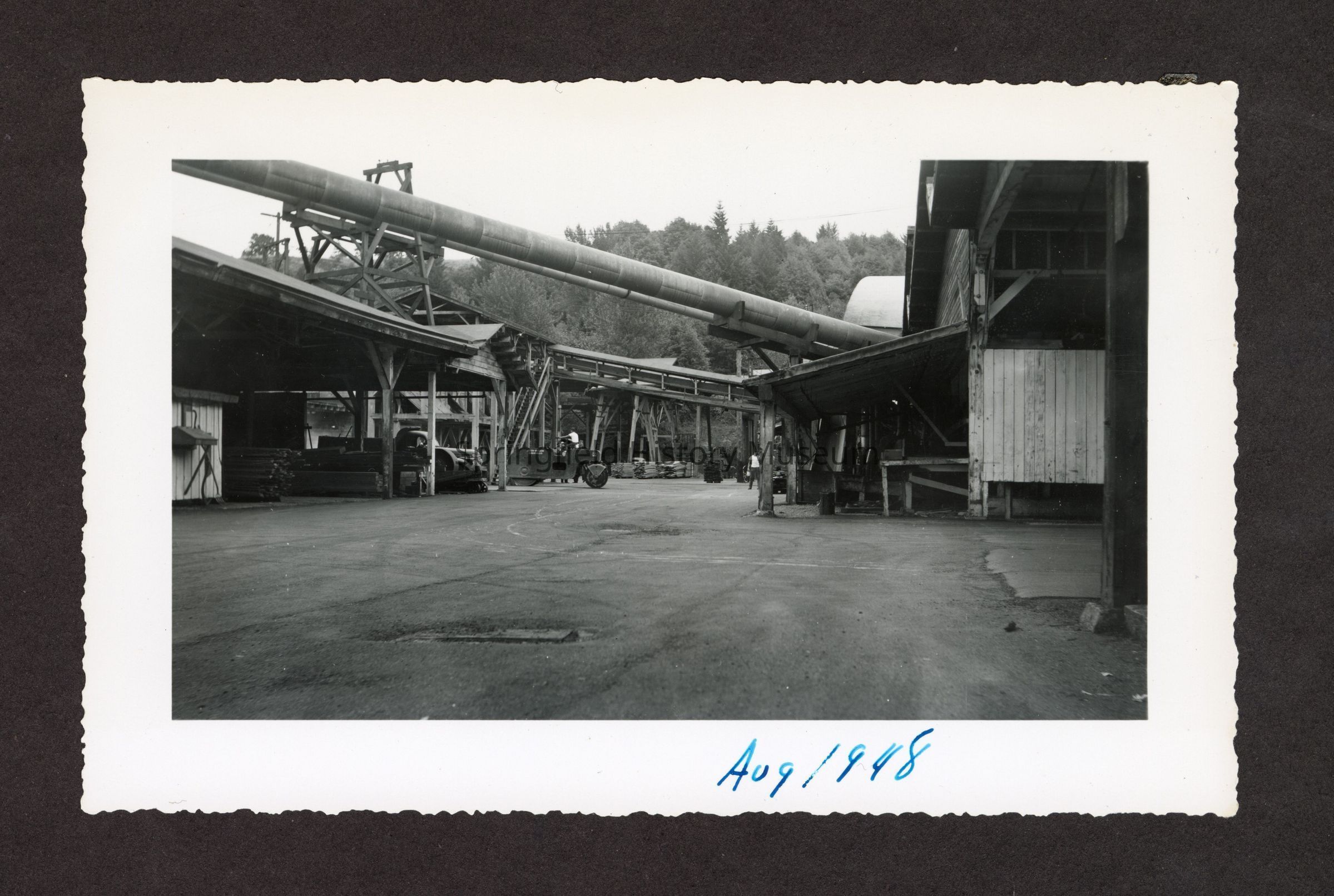 Photograph of paving and mill building at Booth-Kelly Lumber Mill, at bottom in pen: "Aug 1948"