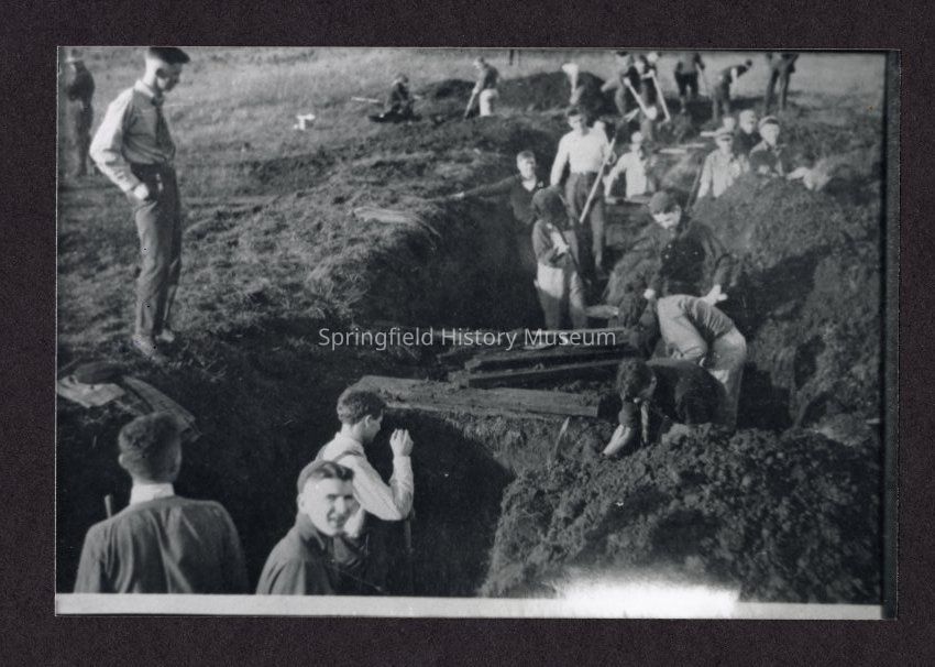 Transcribed inscription on reverse: "Digging Trenches in the open field on the Fairmont side of the IOOF Cemetery-1918, Eugene, Oregon"Photograph Details
