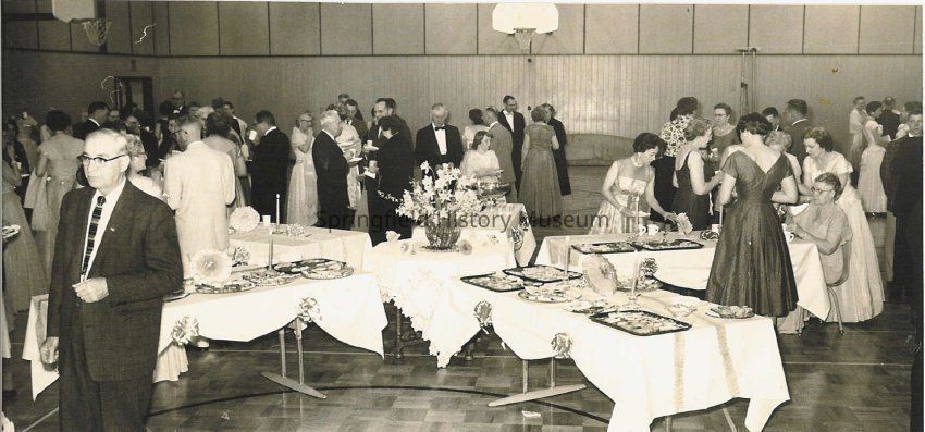 Reception in gymnasium, men and women in evening wear browsing around buffet tables. Undated.Collection