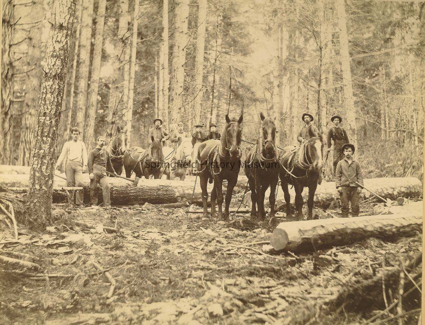 Photograph of people on logs and horses in the woods, circa 1890-1910Entry/Object ID