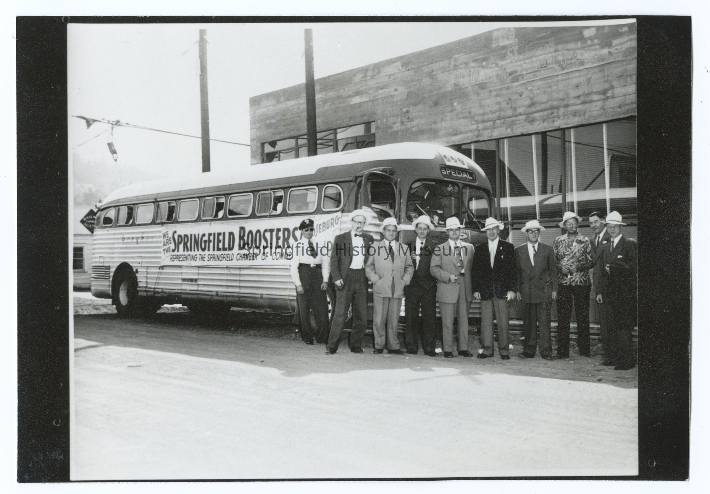 Photograph of people posing in front of a bus, "Springfield Boosters", Chamber of Commerce, Springfield, circa 1950.