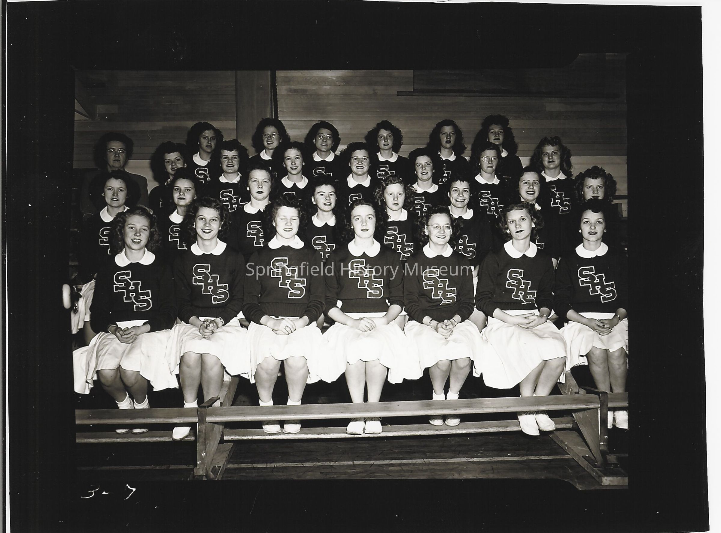 Gym of Springfield Union High with Pep Club dressed in SHS uniforms, sitting on bleachers. 1940s