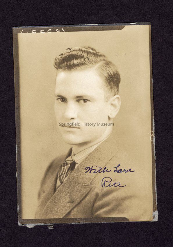 Black and white photograph of Pete Taylor. Handwritten on front is "With Love, Pete". Handwritten on back is "38 Pete Taylor". Taylor was a Junior at Springfield High School in 1938.