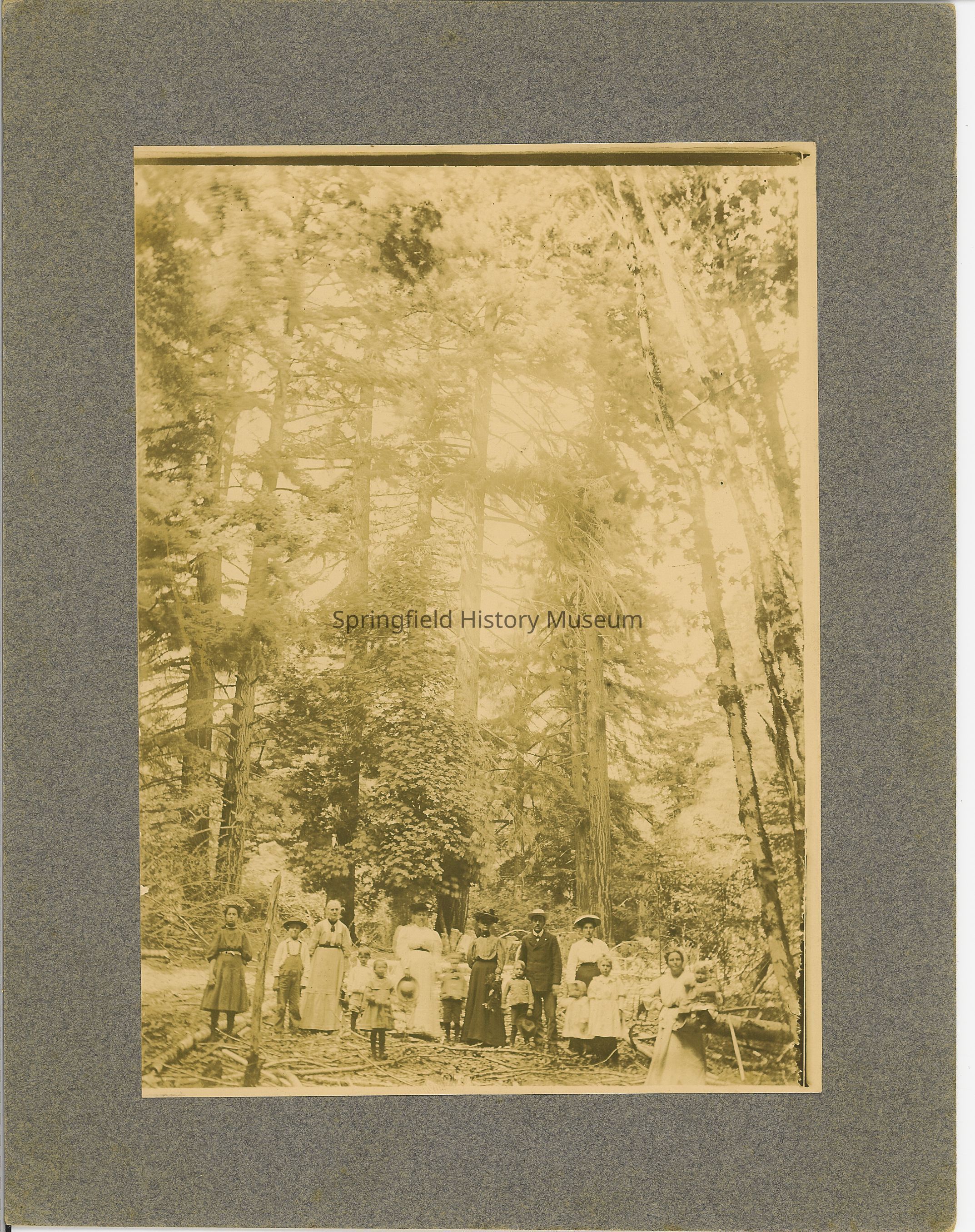 Pine forest surrounding fifteen people known as the Hole Dam family. circa 1905-15