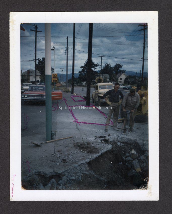 Color photograph of construction of Pioneer Parkway at Main Street and Pioneer Parkway looking north (toward 2nd street). Parking lot by liberty tax at left, with sign saying "We give Gold Bond stamps," and two men working on construction at right. Red pen over image with arrows, "56," and outlines over sections of sidewalk. Steve Moe was superintendent of the project.Collection