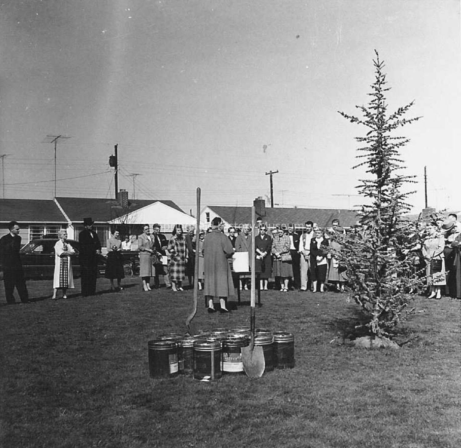 Photograph of scene from planting time capsule near Centennial tree, March 1959.