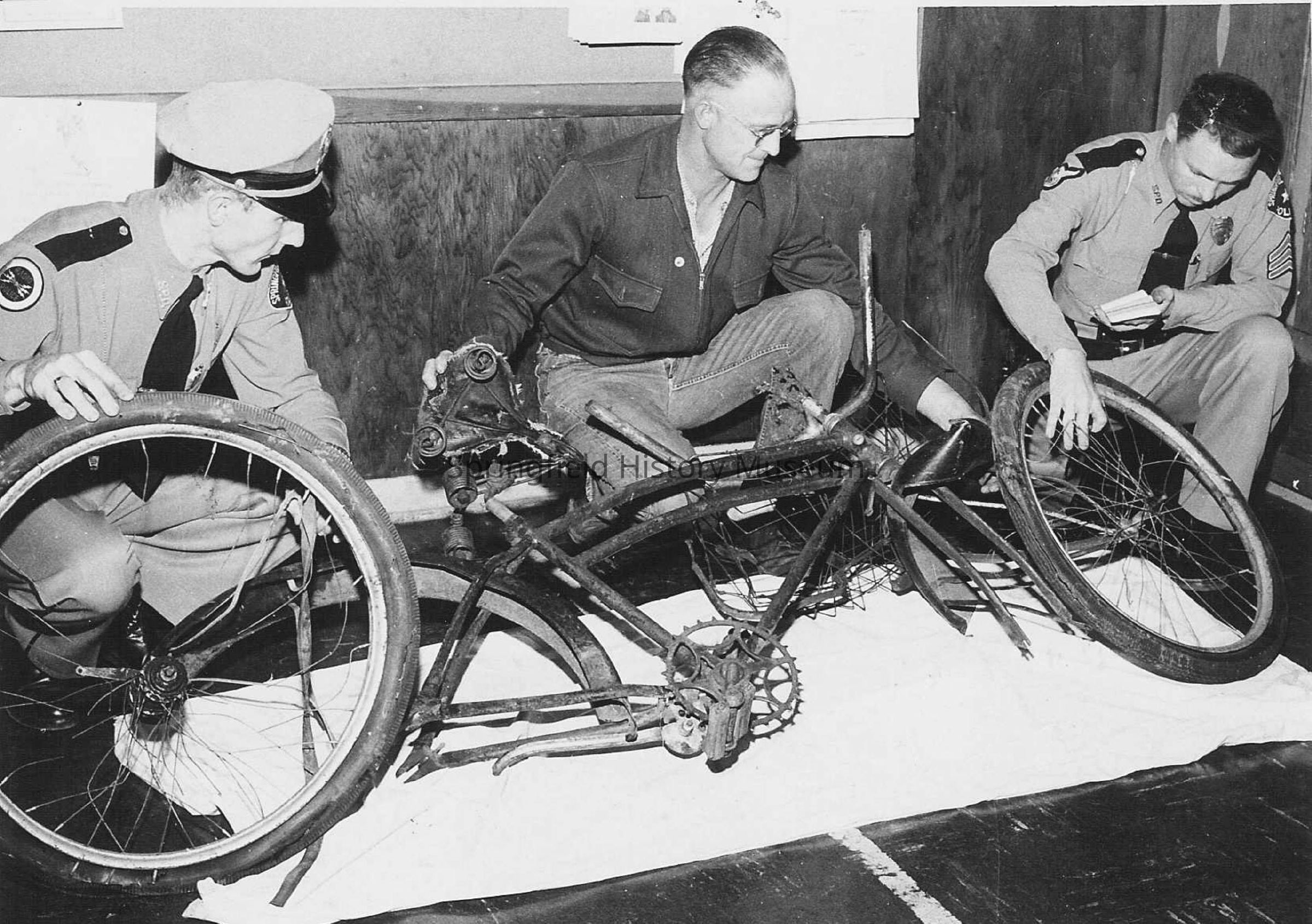 Photograph of two unknown police officers and one unknown plain-cloths man inspecting a partially dismantled bicycle.