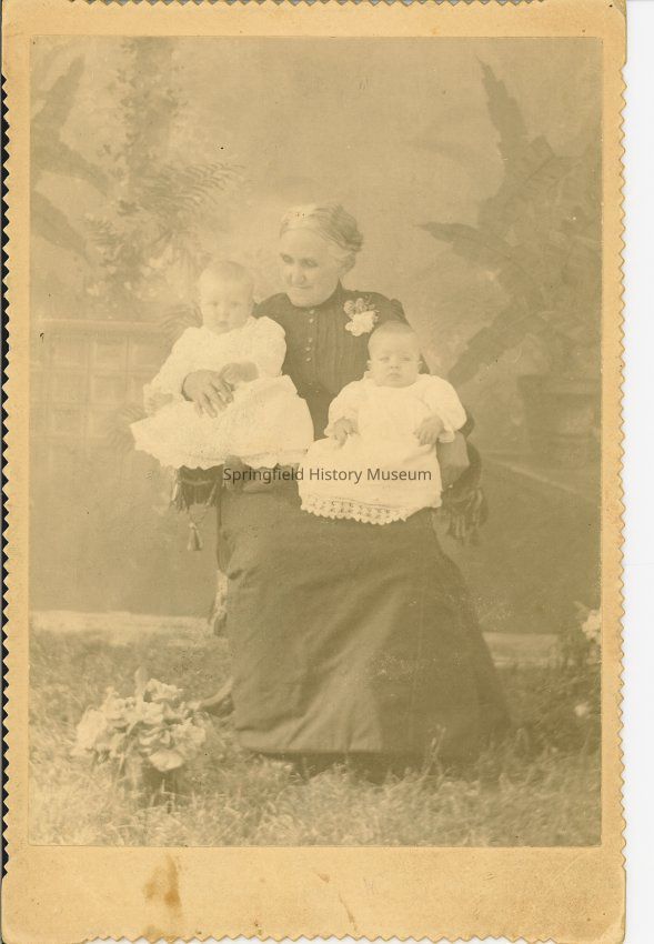 Photograph portrait of great-grandmother, Rhoda Higgins, sitting in chair holding 2 babies, Ethel and Gurvey Howard; circa 1890-1910, mounted on white board.