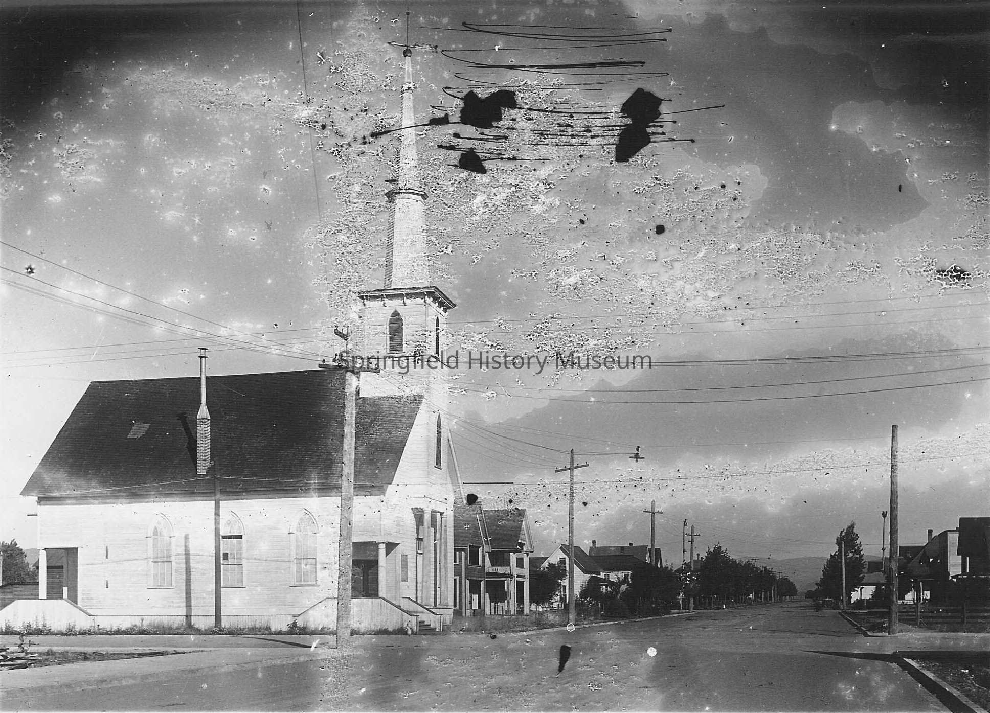 Church with a tall spire and cathedral windows on a street corner. Shows several houses along both sides of the street and power lines with early overhead lights. Possibly First Christian Church after building was moved from Willamette Heights in 1905-MM 7/20/18Photograph Details
