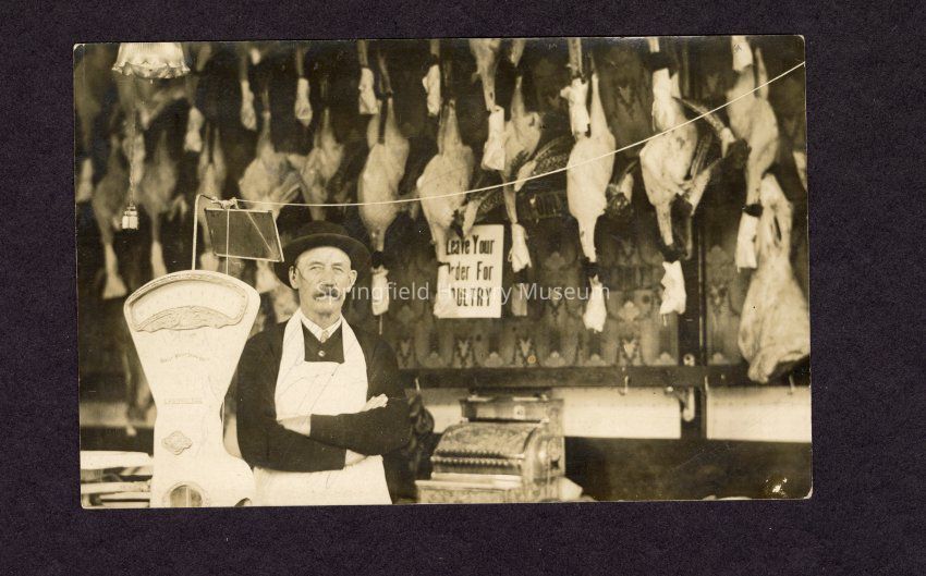 Photograph of Post Card of a Meat Market at 3rd and Main St. J.E. Swarts. Date unknown.