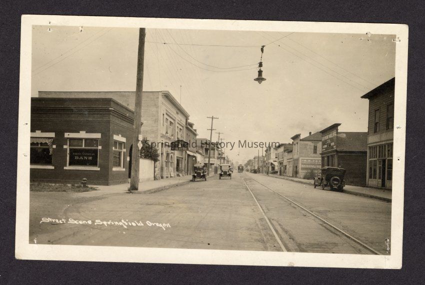 B&W Post Card of a Street Scene Springfield, Oregon. 2nd and Main St. Looking East. Post Mark August 13, 1925.Collection