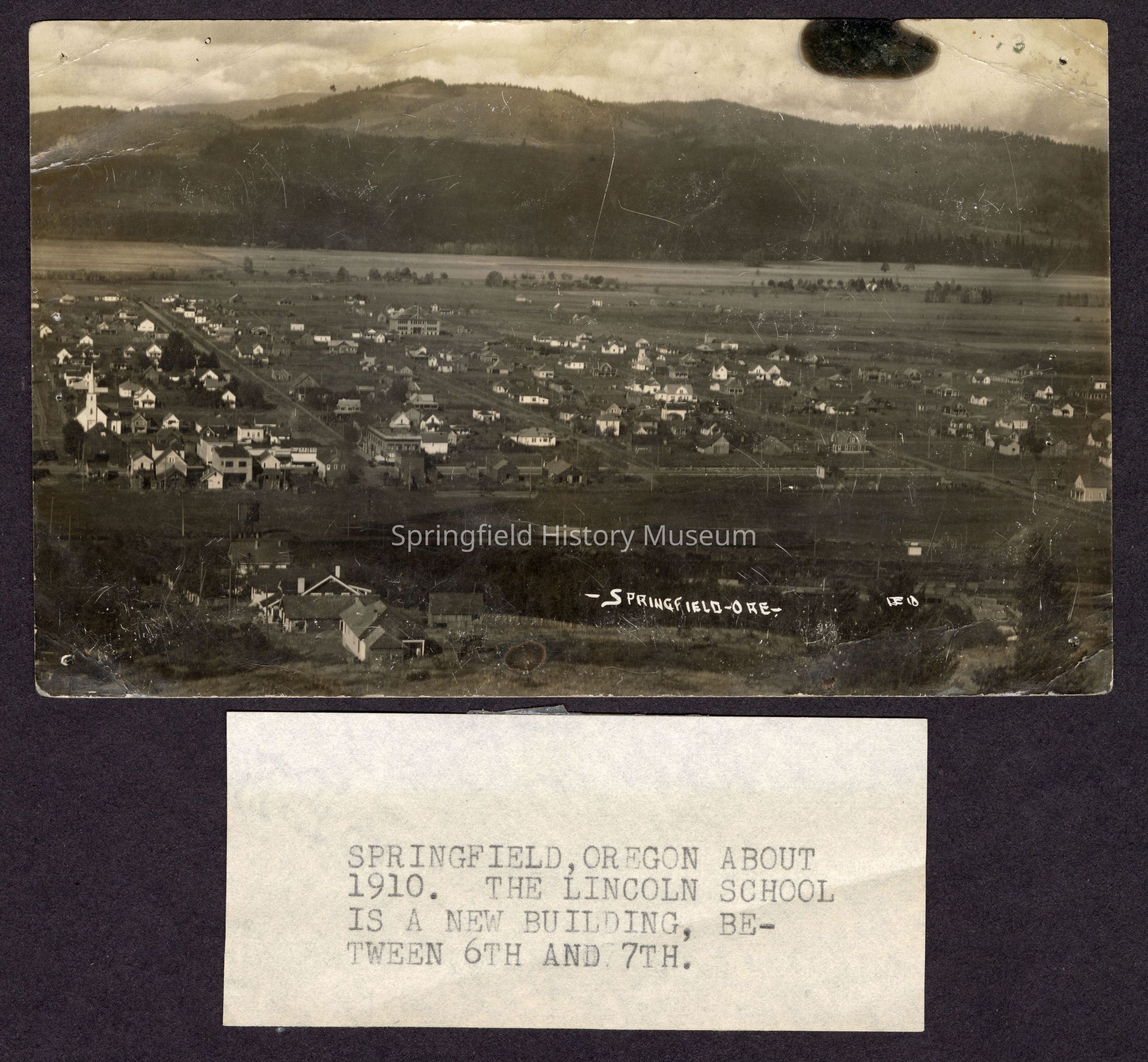 Photograph of Post Card of Springfield, Oregon About 1910. The Lincoln School is a new building, between 6th and 7th.Entry/Object ID