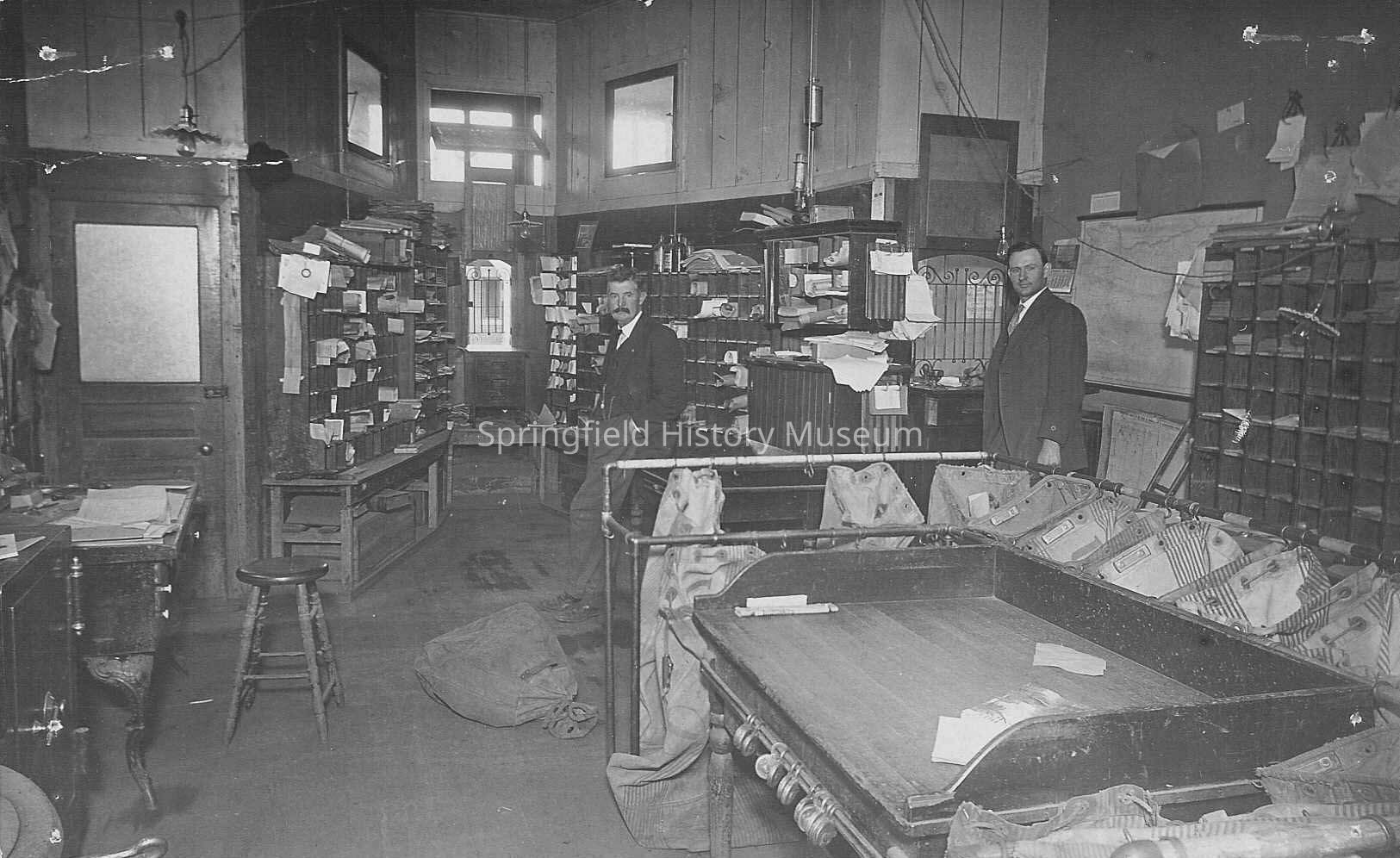 Business & Industry, Post Office, Interior, Mailing, Main Street, 2nd Street, Postmaster, Finley Roberts, Crystal Bryan, Postcard, Business & Industry--Post Office, Springfield--Streets--Main Street, Springfield--Streets--2nd Street, People--Groups & IndividualsDimensions
