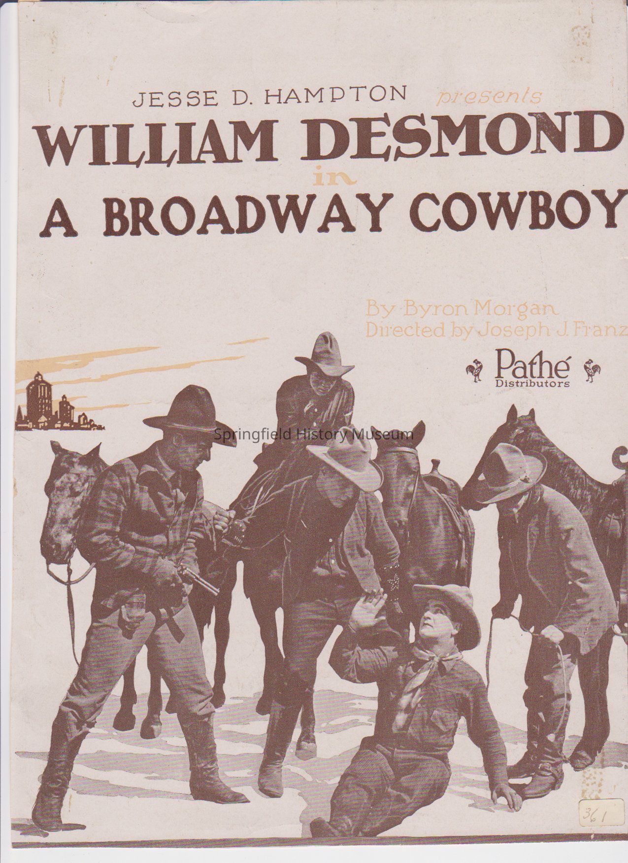 1) Photo / Advertisement for Jesse D. Hampton presents, William Desmond in "A Broadway Cowboy" by Byron Morgan, Pathe Distributors.