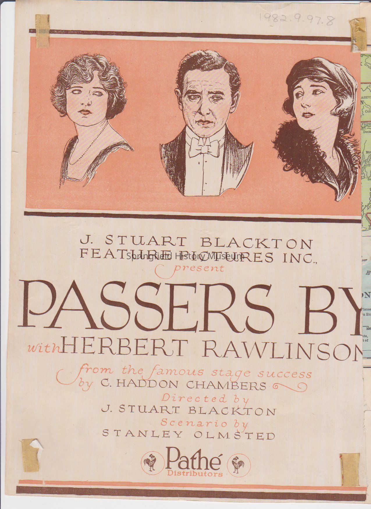 Back: J. Stuart Blackton Feature Pictures Inc. present "Passers By" with Herbert Rawlinson. from the famous stage success by C. Haddon Chambers, directed by J. Stuart Blackton, scenario by Stanley Olmsted. Pathe Distributors.Copyright