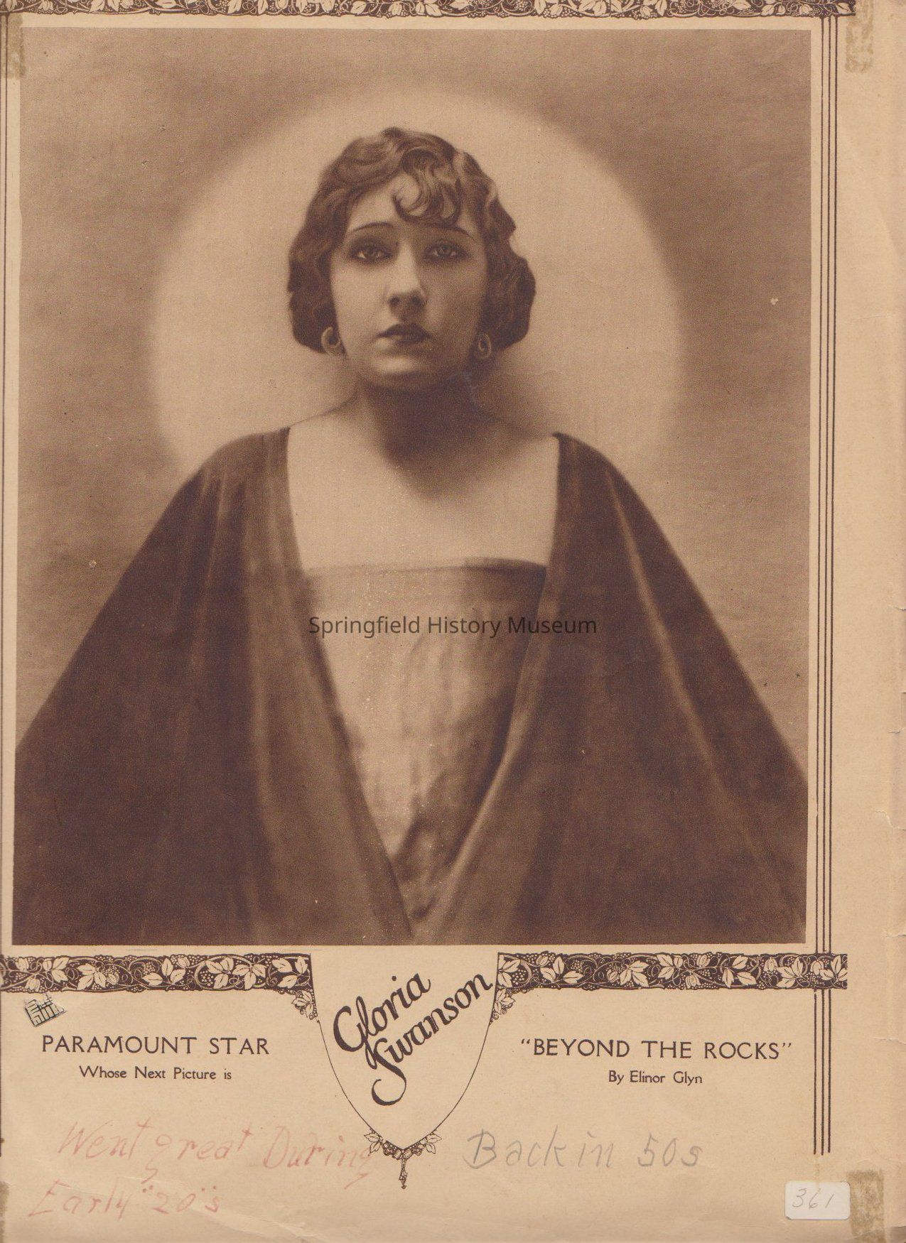 1) Photo / Advertisement . for Paramount Star Gloria Swanson whose next picture is "Beyond The Rocks" by Elinor Glyn. Back: Paramount Pictures, "Lady Godiva" from Alfred Tennyson's Poem.