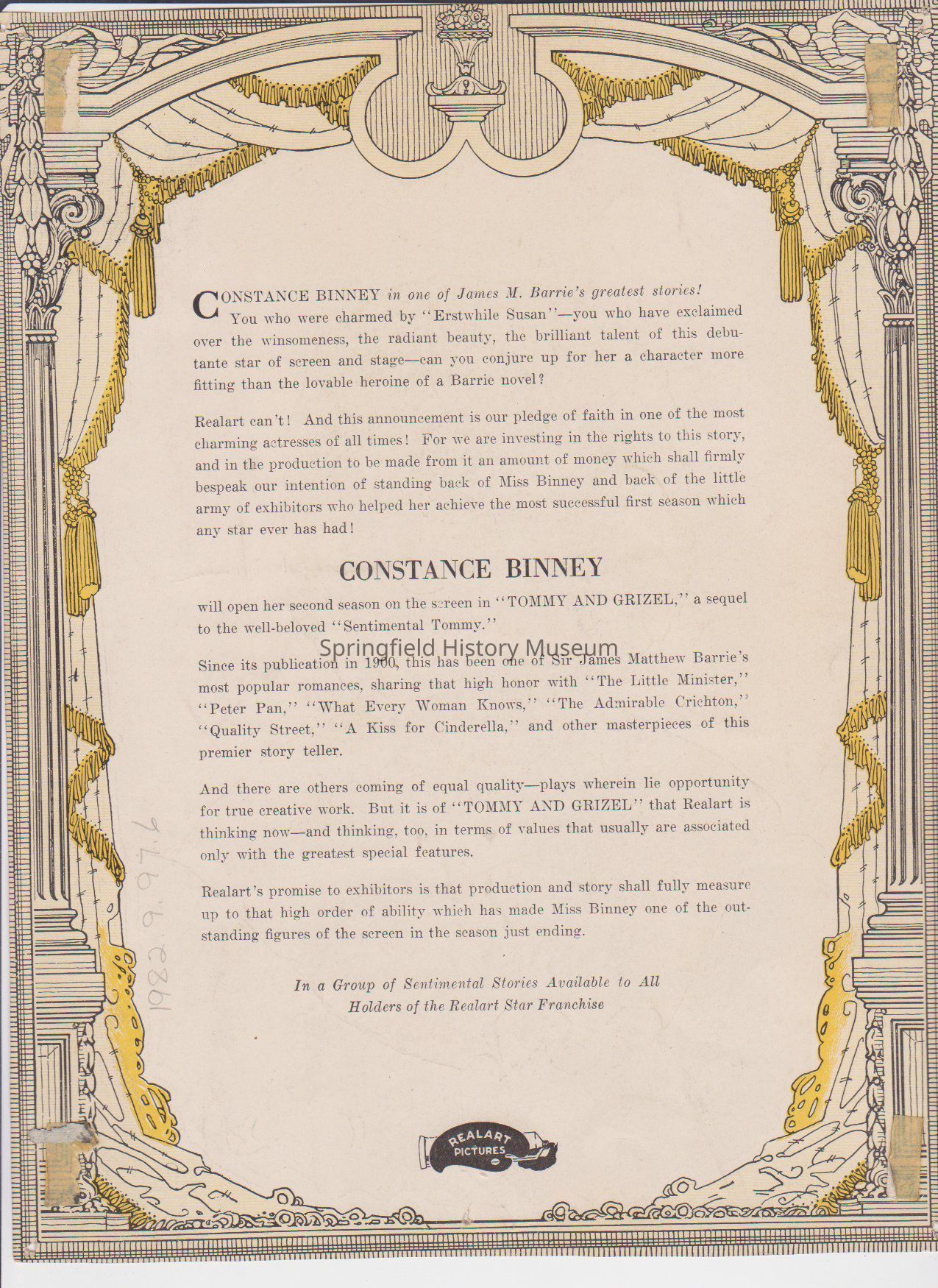 1) Photo / Advertisement for Realart Pictures, Photo of Constance Binney. Back: Constance Binney in one of James M. Barries "Greatest Stories."