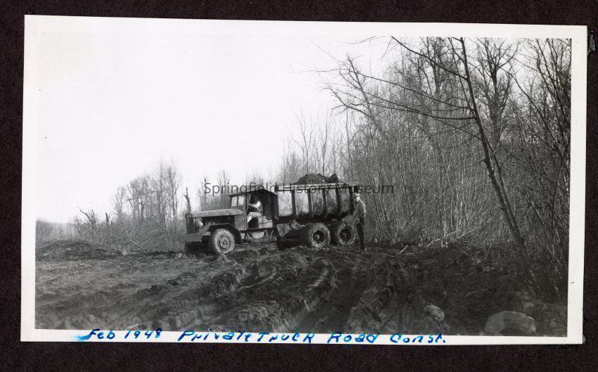 Photograph of private truck road construction, on bottom in pen: "Feb 1948, Private Truck Road Const."
