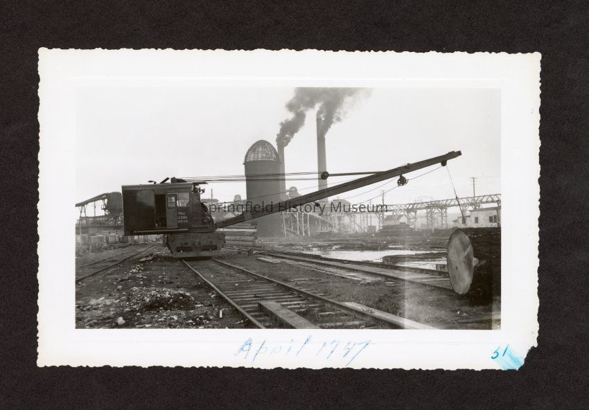 Photograph of rail crane for lifting logs from or to pond or to lift logs on to rail cars, on bottom in pen: "April 1947" and "38", at Booth-Kelly MillMade/Created
