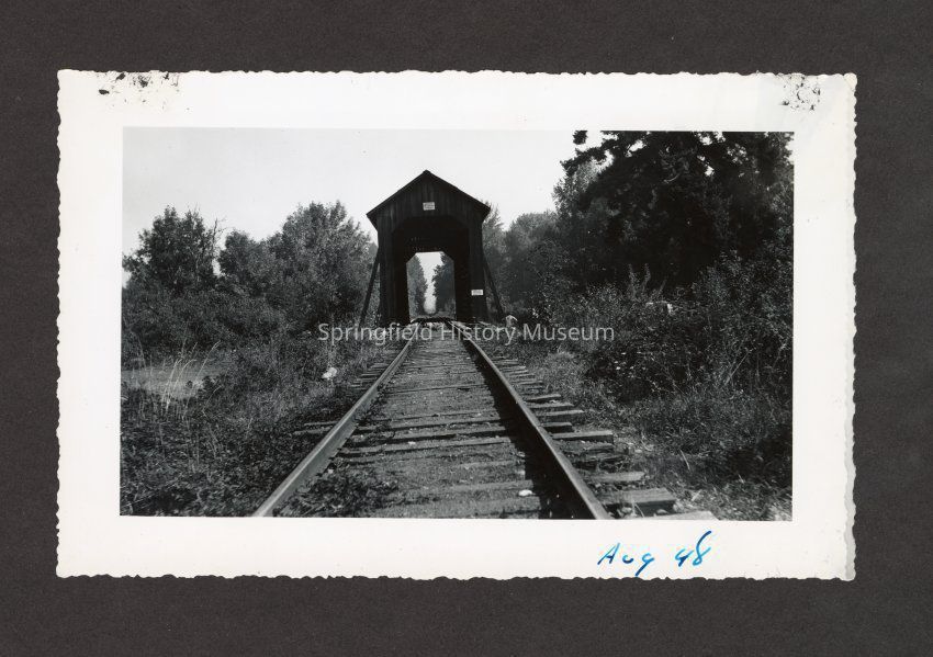 Photograph of railroad tracks and a covered wooden bridge, 1948Entry/Object ID