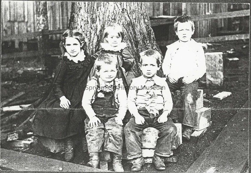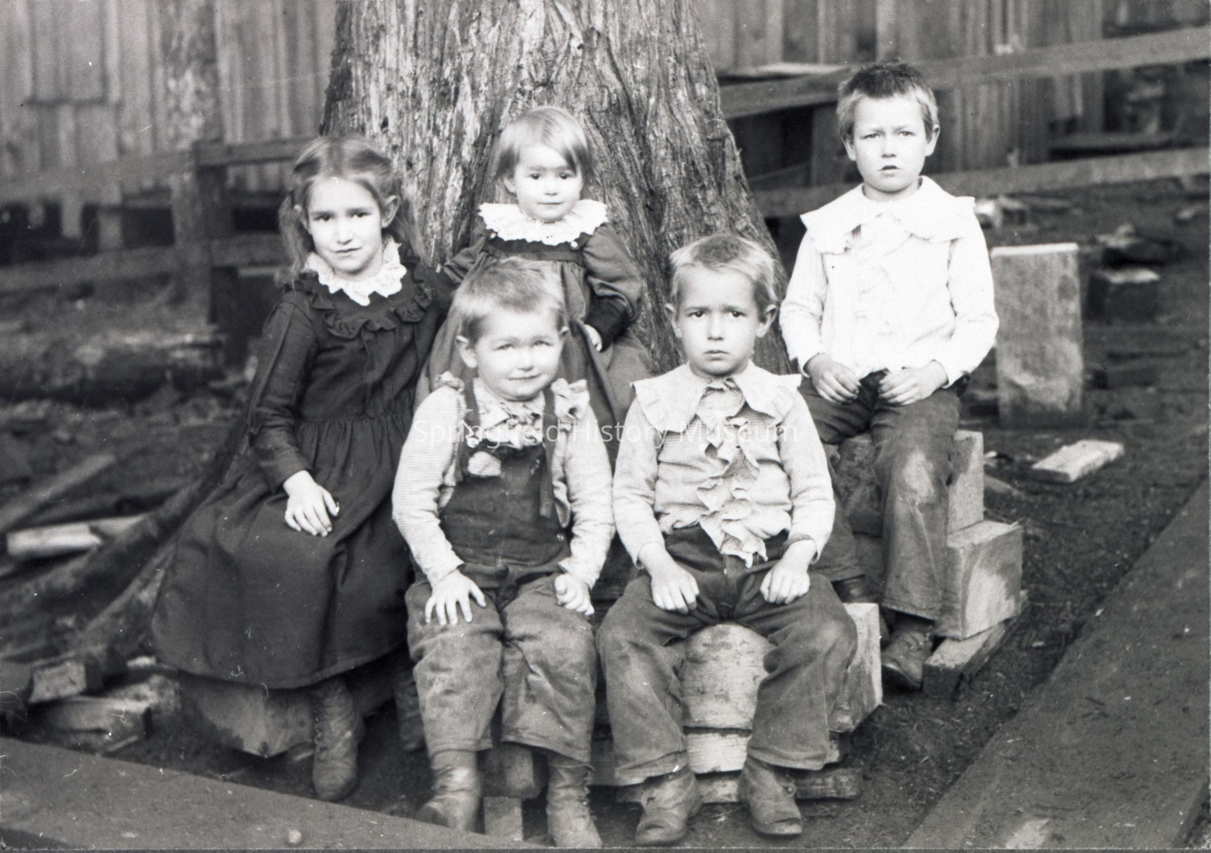 Rathbun children sitting in front of a tree. Left to right front: Vernon and Warren. Back row: Flossie, Jessie and Richard, circa 1900, Saginaw, Oregon.