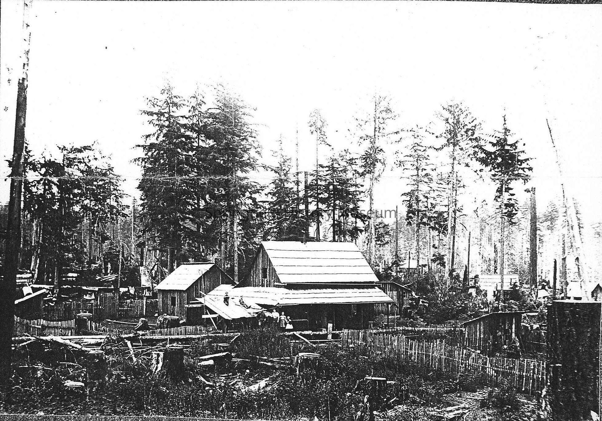Photograph of Rathbun home at last Saginaw Mill. Two children sitting on roof, group standing in front of house. circa 1900