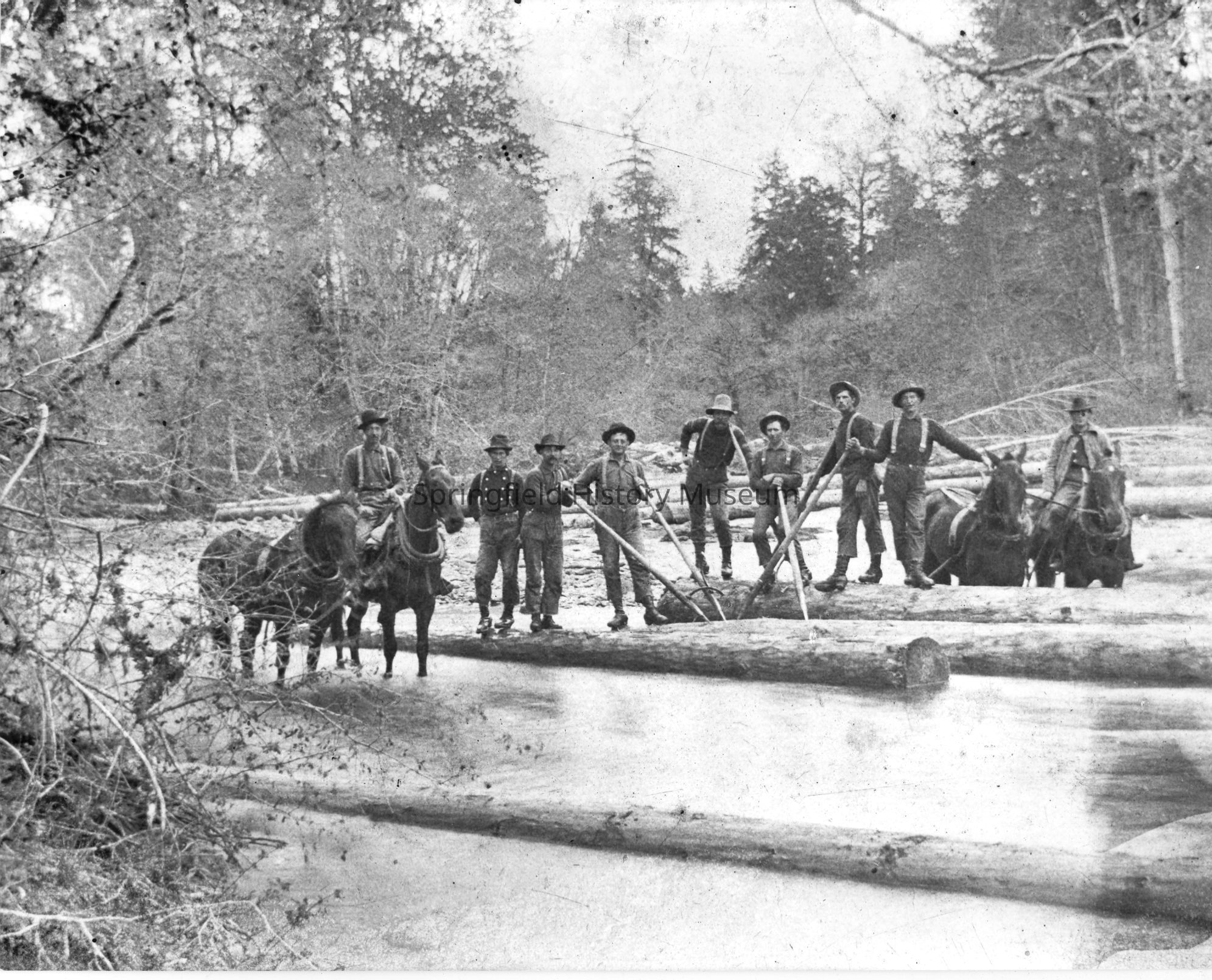 Logging, Fall Creek Log Drive, Loggers, Horses, Lowell Region--Fall Creek, Logging--Personnel, Logging--Transportation--AnimalOther Names and Numbers