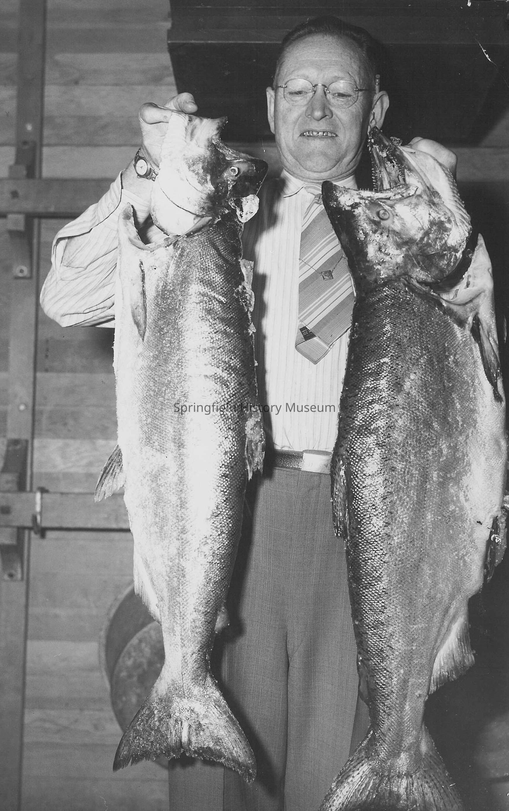 Photograph of Rotary Club; an unknown fisherman holding two large salmon. Man is wearing dress clothes and tie, not fishing clothes. Undated.Collection