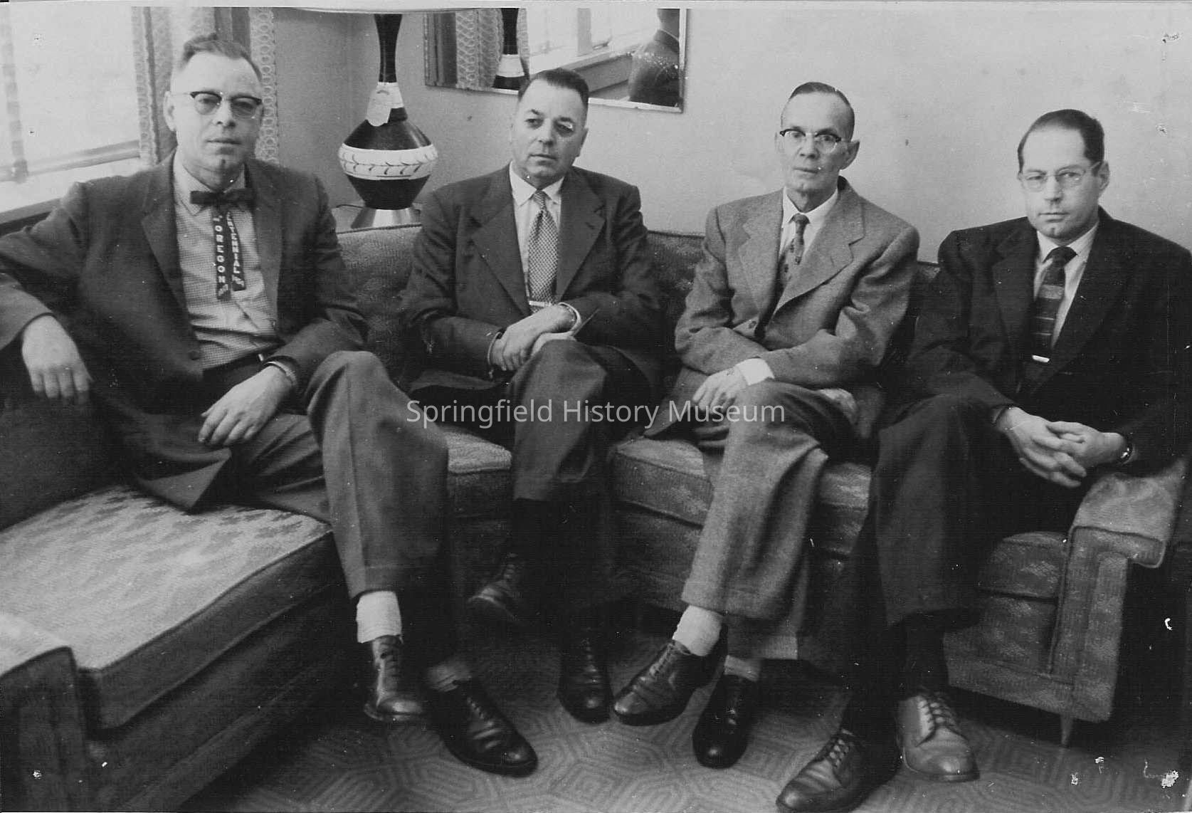 Photograph of Rotary Club, four businessmen seated on corner couch. Larson Wright on left, Harry Wright on far right. Undated.Collection