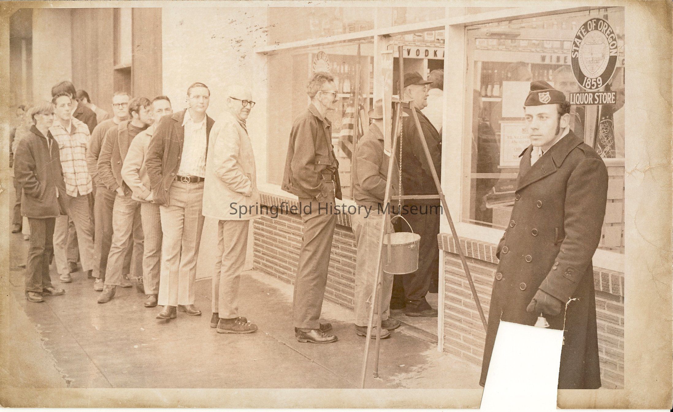 Photograph of Salvation Army bell ringer, with line outside State Liquor Store, Springfield OregonEntry/Object ID