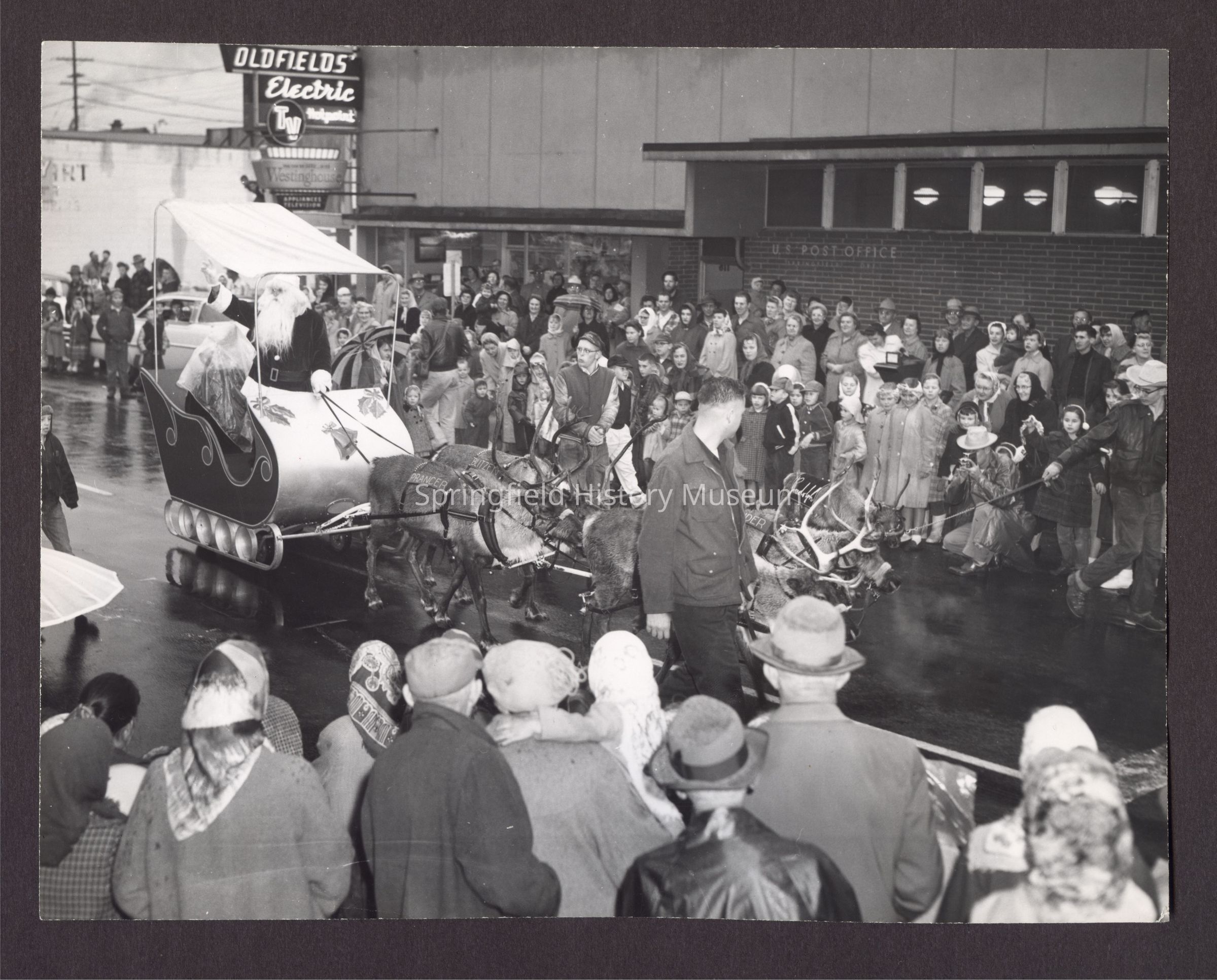 Photograph of Christmas Parade, Springfield, circa 1950s. Santa Claus in his sleigh with four reindeer. Undated, circa 1950sPhotograph Details