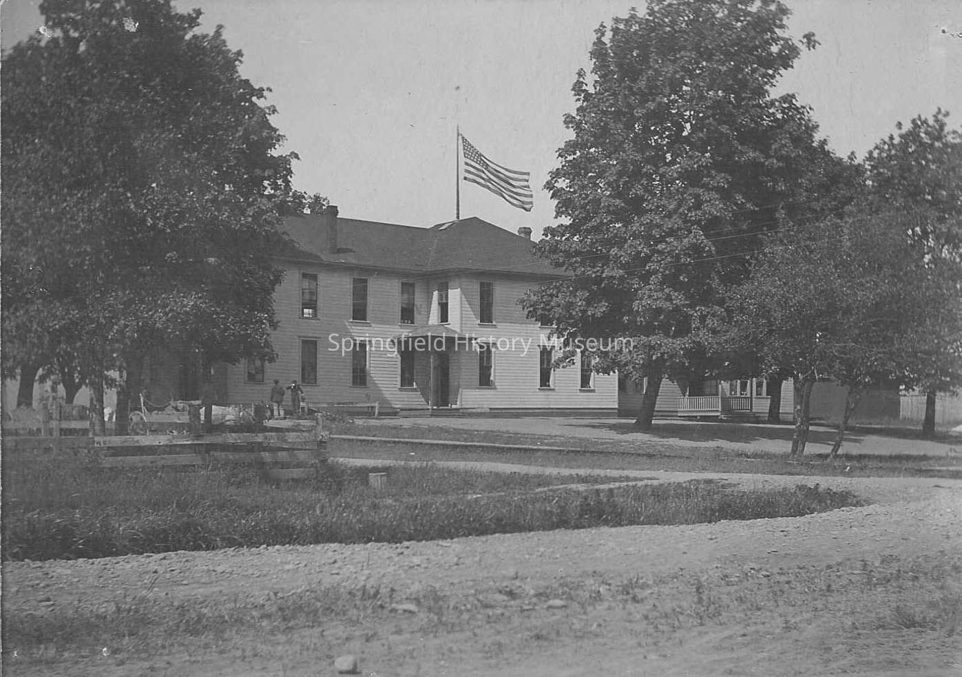 Photograph of school house with large flag. Two story wooden building with large trees all around. Building is beside unpaved road. [Could be old Springfield High on Mill Street. If so photo was taken on West D Street.] Postcard.