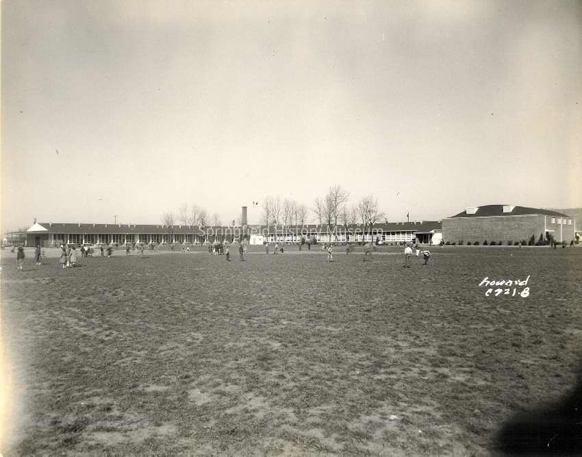 Photograph of school building with students on playground, 1954.Entry/Object ID