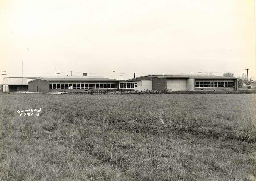 Photograph of School District 19 building. Taken from an angle where no street shows. There is dirt turned over as if some new construction was just done or about to begin. Marked Howard C721-6.
