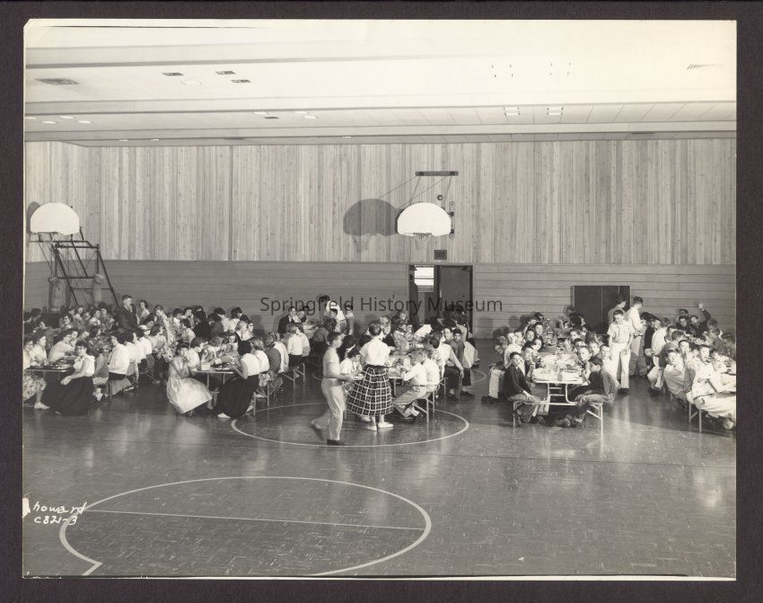 Photograph of school lunch in the gym. Date unknown.Entry/Object ID