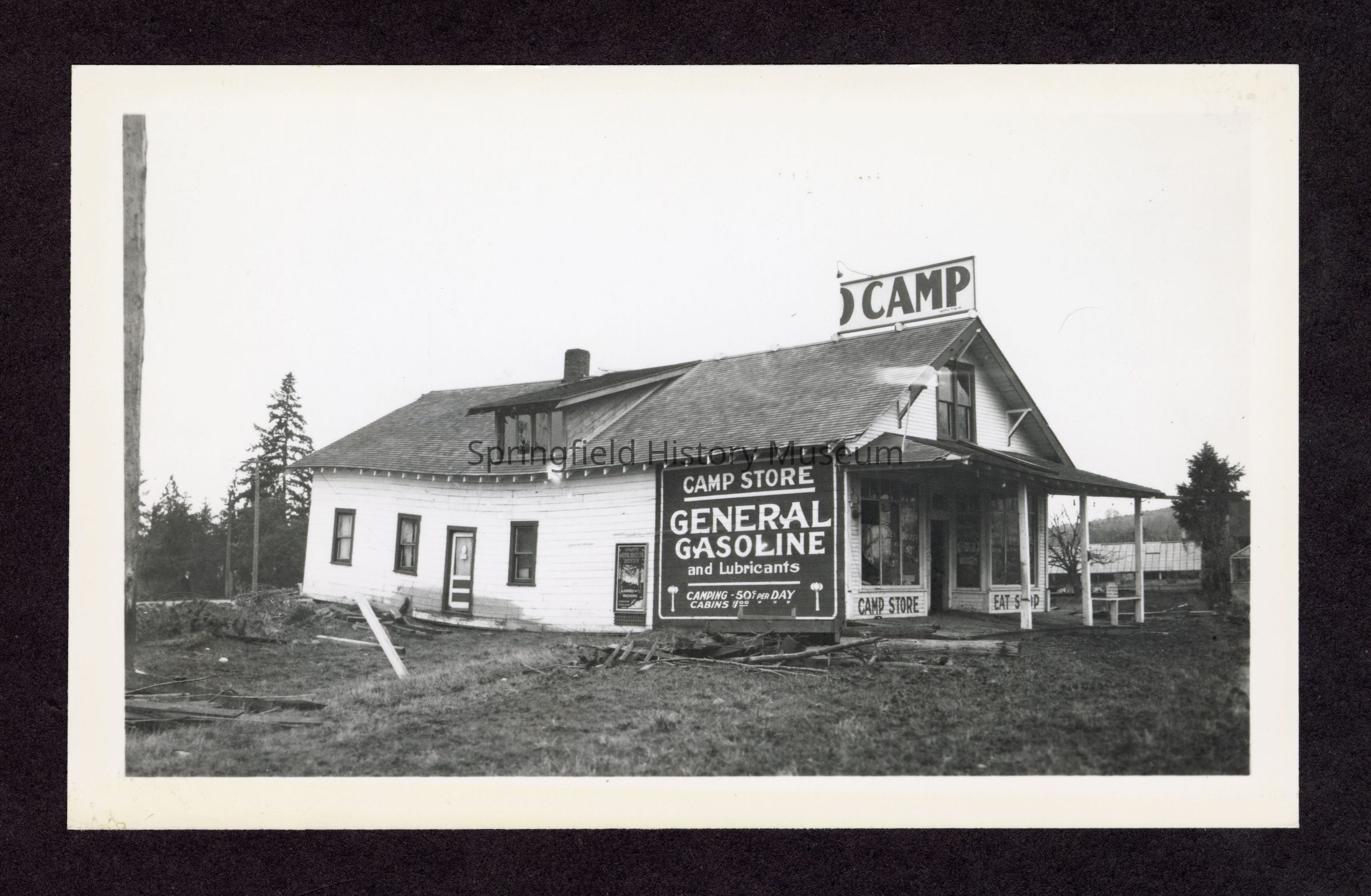 Black and white photograph of Seavers Auto Camp store looking southeast from Pacific Hwy after 1927 flood. Sign on side says, "Camp Store - General Gasoline and Lubricants - Camping 50c per day - Cabins $1 " "," and a smaller sign in the window reads, "Visit McKenzie River - Guides & Packers - Eugene, Oregon." Stamped on back, "Stephen Moe Company, 3698 Franklin Blvd..."Collection