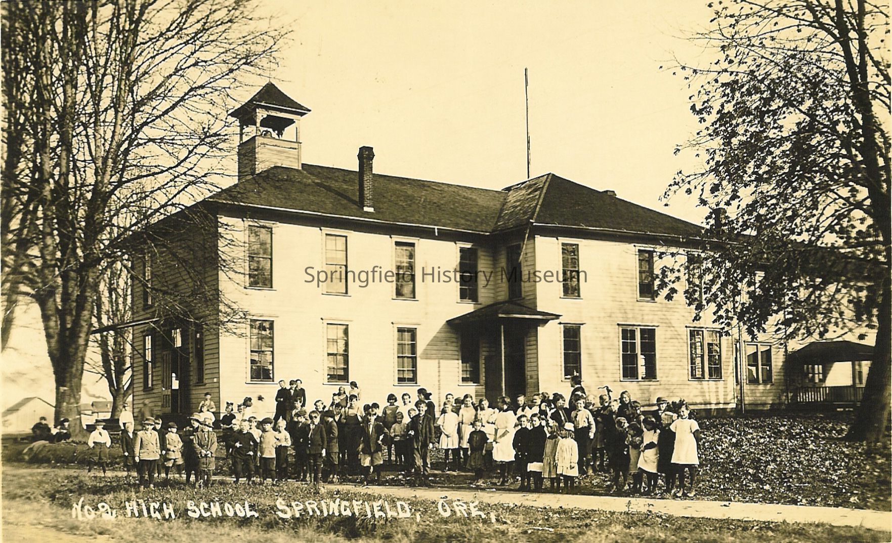 Schools, Springfield High School, Students, Faculty, Mill Street, D Street, E Street, Bell Tower, E.V. Lilly, Gertrude, Postcard, Schools--Springfield High School, Schools--Faculty & Students, People--Groups & Individuals, Springfield--Streets--Mill Street, Springfield--Streets--D Street, Springfield--Streets--E Street