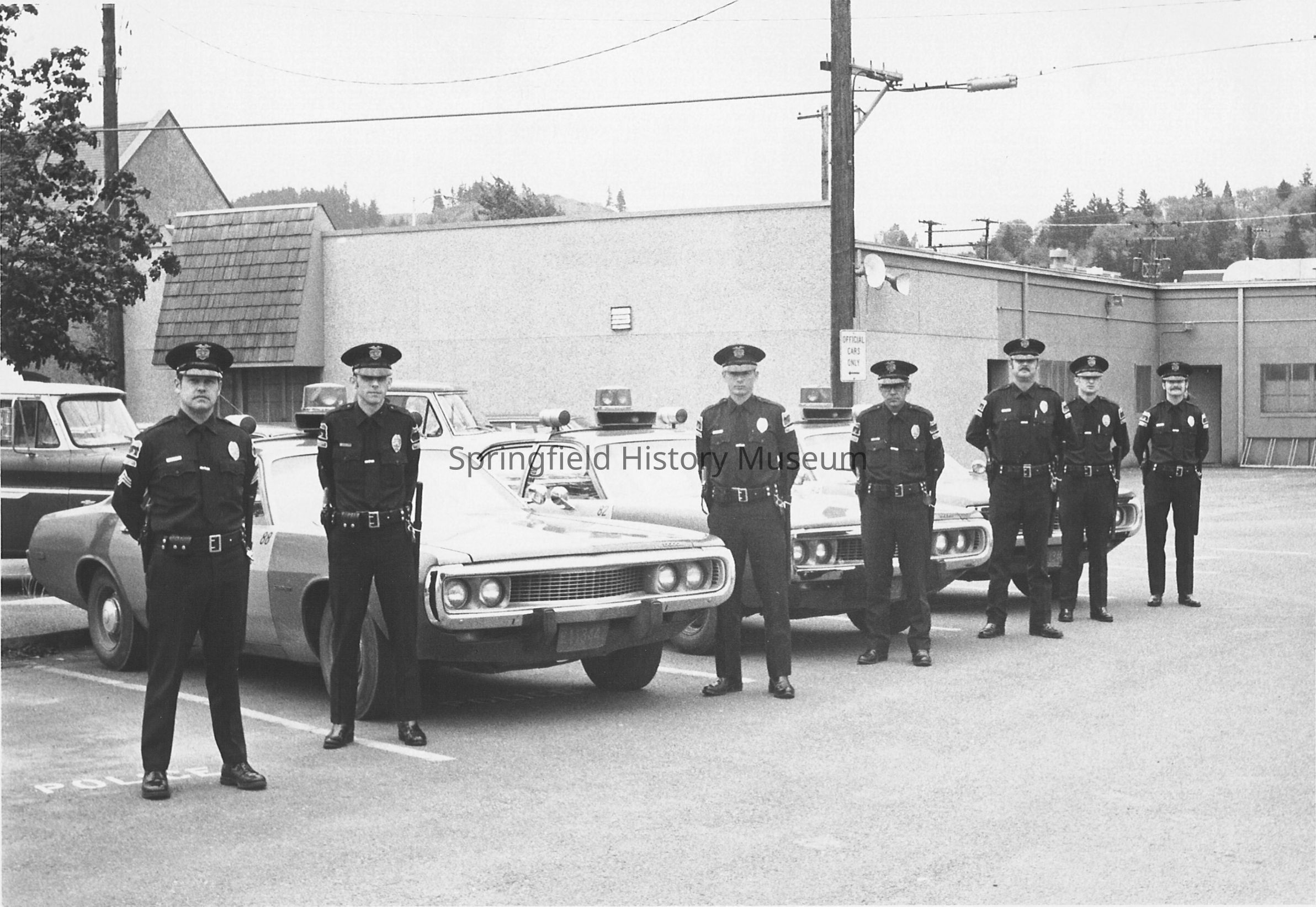 Seven police officers posed in front of 3 police cars at the back of the Police Dept. Bldg. Officers identified on reverse as; Sgt. Mogensen, John Madden, Phil Roberts, John Tart, Chad Long, Dave Young and Donnie Dickerson; no date.