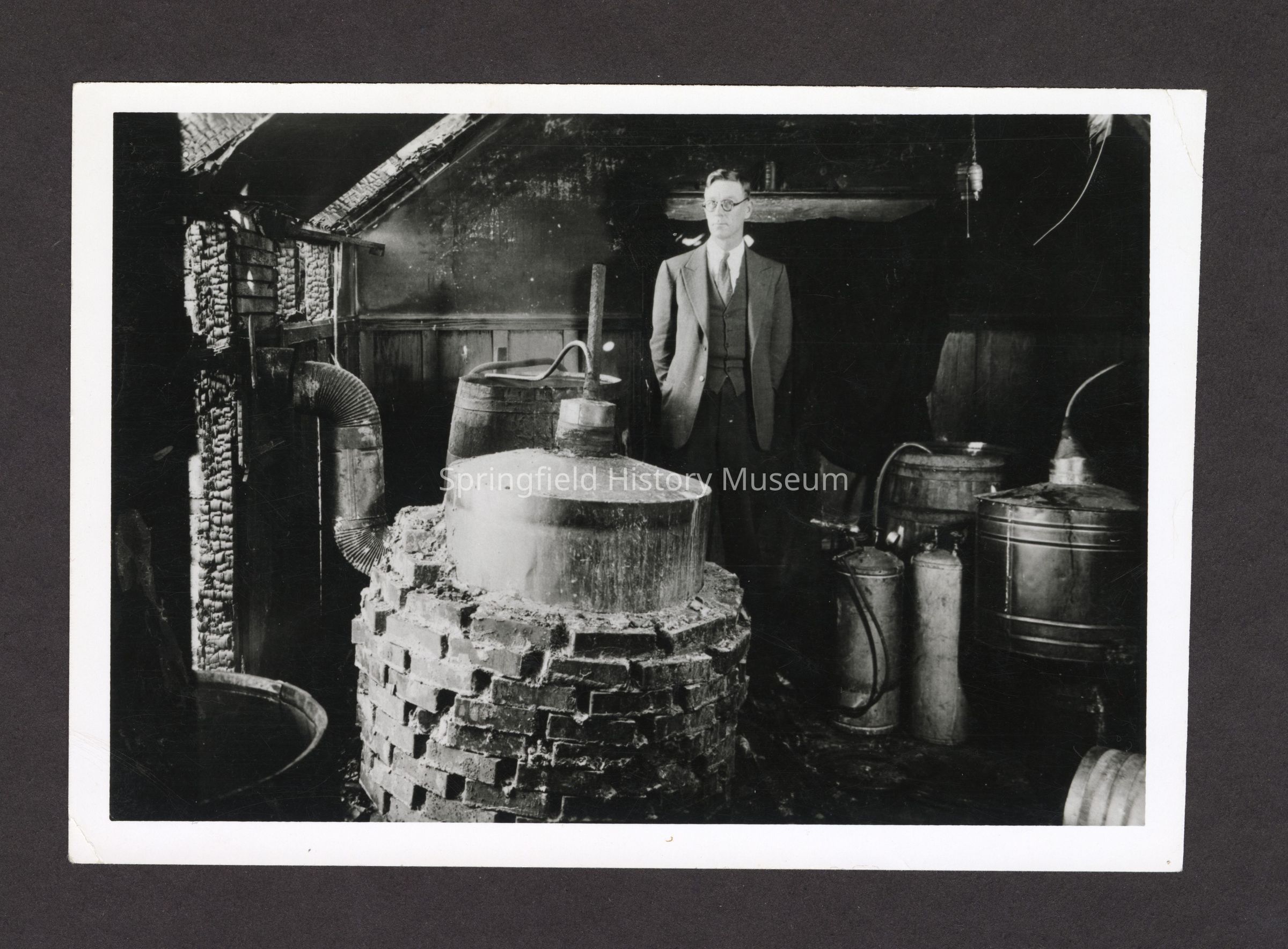 This photo is also found in the LCHM archive, their description: "Sheriff C.A. "Tom" Swarts posing with two illegal stills discovered at 1291 West 2nd Avenue in Eugene, Oregon, when one of them caught fire. The stills were described as one having a 75 gallon capacity and the other having a 35 gallon capacity. From its condition in the photograph, it appears that the fire occurred in the larger still. Although Prohibition had been repealed in 1933, before this event, it was still illegal to make liquor without a license."Copyright