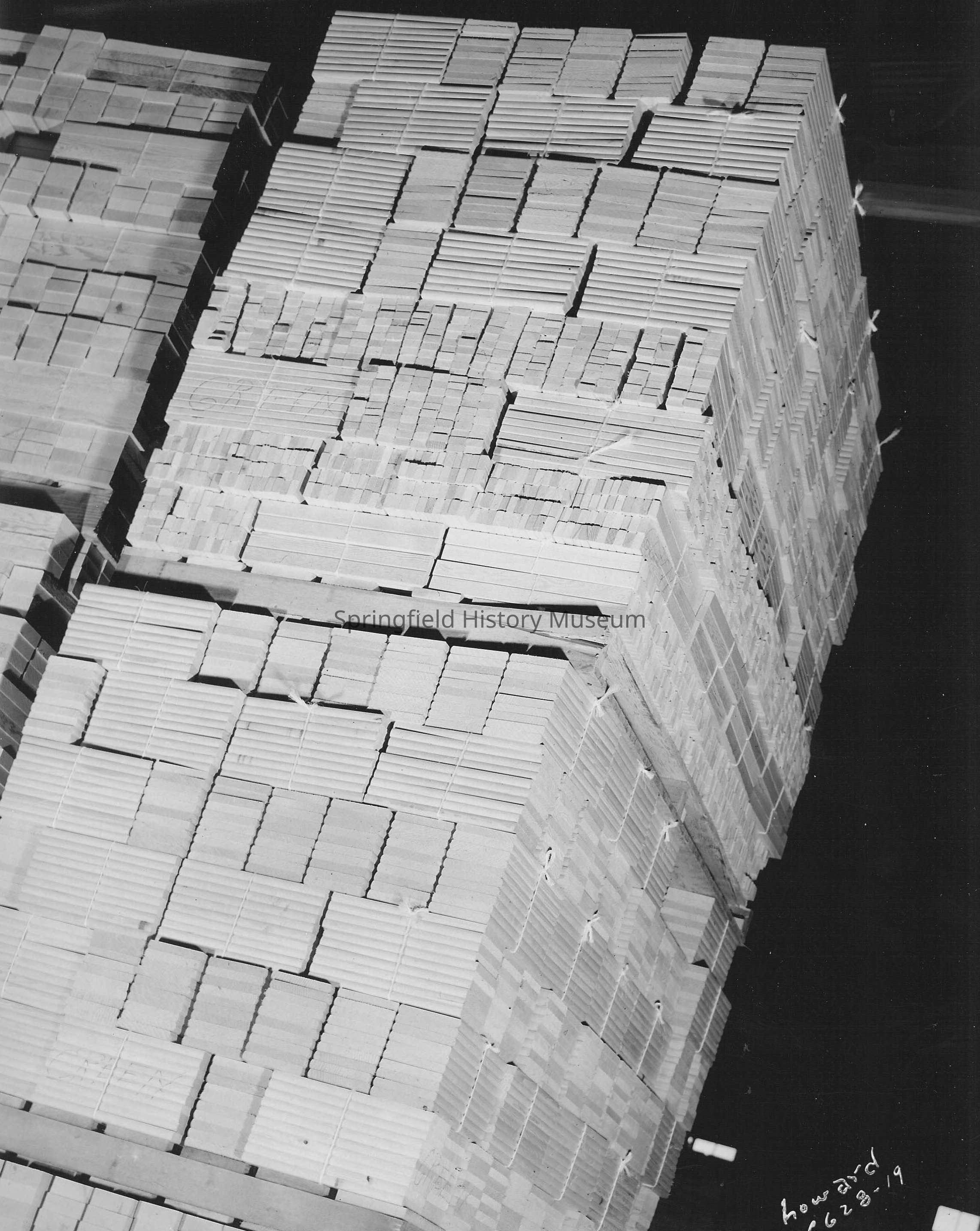 Bundles of short lumber stacked high. Marked Howard C628-19.
