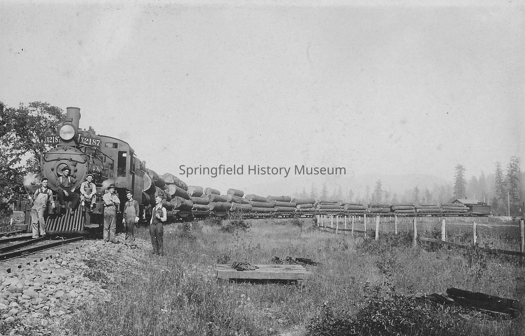 Photograph of Southern Pacific train, X2187, hauling logs on the SP Wendling branch. Five men on train tracks in front of the train.