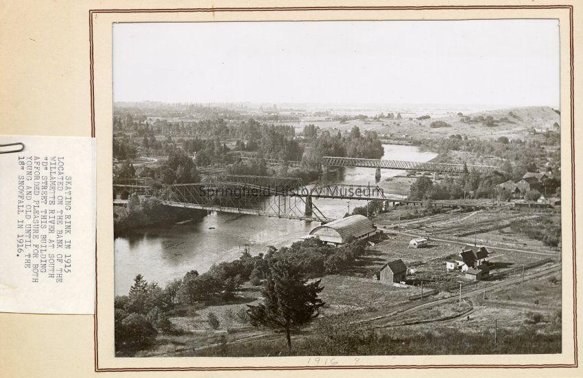 B&W Photo in White framed folder of Skating Rink in 1915. Located on the bank of Willamette River at South D Street Springfield, Oregon. This Building Afforded Pleasure for both young and old until the 18" Snowfall in 1916. The1907 Sanborn map shows a skating rink on Main Street. It was later moved to this site on the river at South D Street.Collection